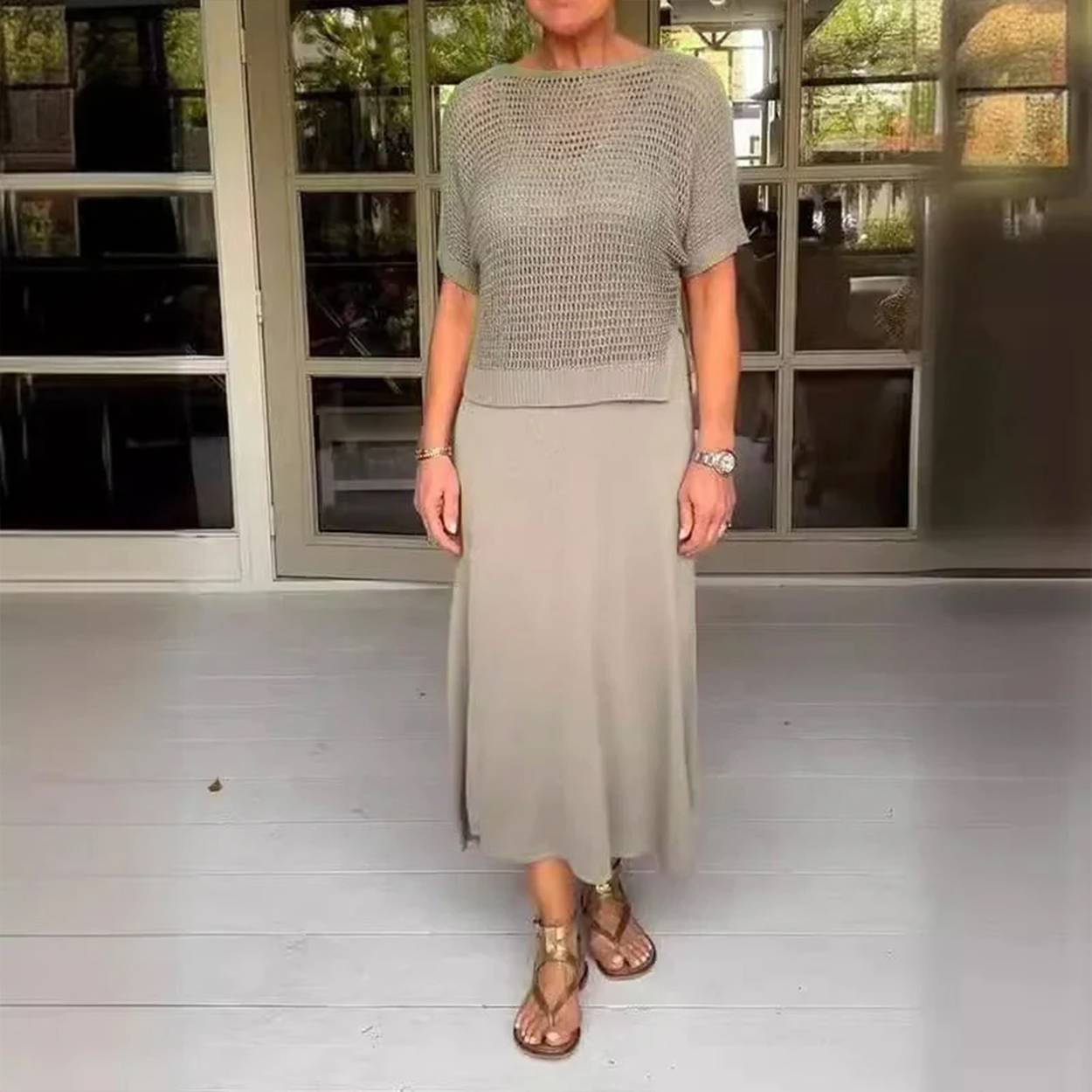 The Navy Timeless Two-Piece Set brings a breath of fresh sophistication to your everyday wardrobe. Featuring a delicately perforated short-sleeve top and a long, flowing dress, this ensemble is designed to blend comfort with classic style. Whether you're running errands or heading to dinner, this set keeps you looking polished without the effort.